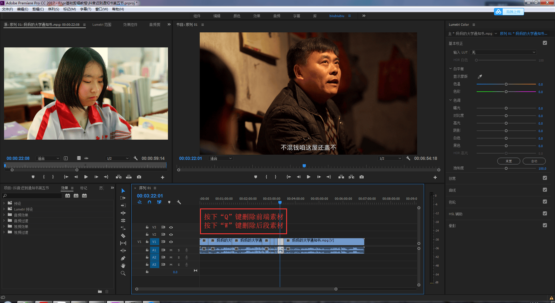 ③【波纹删除小技巧】我们剪辑的时候,如果想删除某一段中间的素材的前面或者后面,需要我们不断的倒腾几个素材的位置,这样就非常麻烦,我们可以用波纹删除,简单一下就可以搞定,如果不想要前面一段,我们可以把时间线移到想要截取的位置,按一下Q前面的素材就被删除了,而且还会自动把后面的补齐,如果想删除后面,按下W就可以了