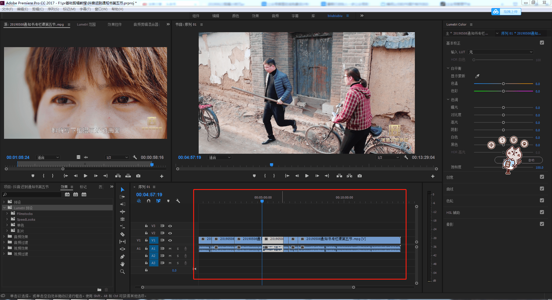 ④【统一调色】不熟悉剪辑软件的同学,初次调色一定非常要知道如何才能统一调色,下面给大家讲一下详细的制作步骤,在剪辑影片的时候,肯定都是由一段一段的素材结合起来的,如何统一调色这也是学员群经常会问到的问题,同常我们就是先调好一段然后复制到其他段落,为了更加简便高效,我们可以先选中一下他的素材然后点到效果控件,在效果控件我们可以看到两个文件,点击空白的那一个,然后把LUMETRI颜色加到这里然后调一下颜色,可以看到后面只要是同一段素材这个调色都被应用上了,这样可以保证调色的一致性,是不是很方便