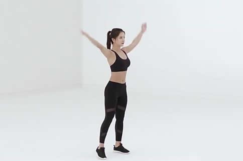 1、双腿向外跳开,膝关节自然弯曲,髋关节自然向外展开。