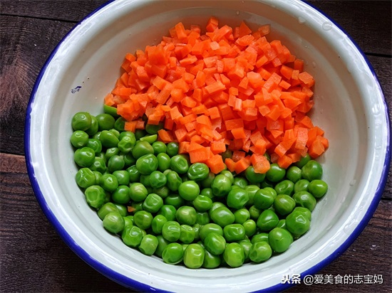 2,接着将所有需要用到的食材准备好,青豆洗净后放入沸水里烫熟,胡萝卜洗净后去皮切成细条,再切成丁,放入沸水里烫熟。将熟青豆和熟胡萝卜丁装碗里备用。