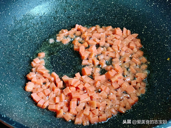 3,然后将火腿肠切丁,放油锅里煎香,加了火腿丁的炒饭味道更香。