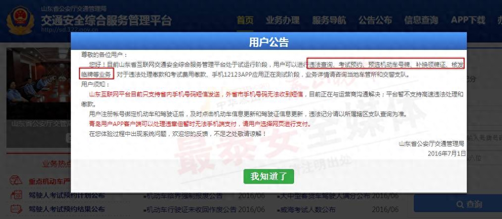 据介绍,山东省互联网交通安全综合服务管理平台目前正处于试运行阶段,用户注册登录后可以进行违法查询、考试预约、预选机动车号牌、补换领牌证、核发临牌等业务。