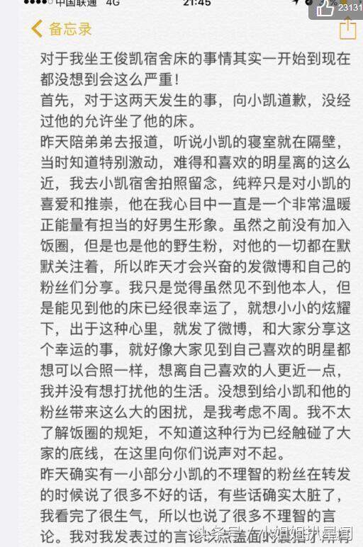 现在她的微博关于王俊凯的微博全都被删,只留下一段长文: