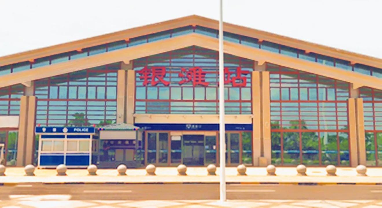 银滩站位于海南省儋州市境内,坐落在海南西线高速公路西侧、洋浦第二快速路北侧、新盈农场光村一带,西距光村银滩休闲度假区约2公里,东距西线高速公路约4公里,南距洋浦第二快速路0.8公里,为本线中间站,是洋浦及周边居民外出返乡的重要乘车站点,站房采用三段式构图,双向人字坡屋面十字交叉组合形式,别具匠心,候车大厅采用双层叠檐,整个建筑形式舒展、别致。