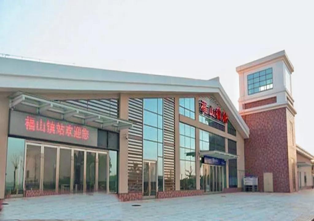 福山镇站位于海南省澄迈县福山镇西线高速公路福山出口白堂村附近,距离县城约24公里,站台规模为2台4线,站房总面积2000平方米,站房造型采用简欧风格,坡屋面与“灯塔”相互映衬,典雅别致,建筑风貌与邻近的福山咖啡风情镇融合,体现了建筑与环境相协调统一的设计理念。