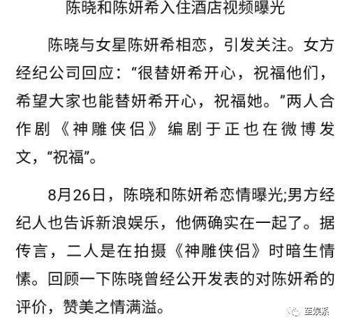 15年陈晓和陈妍希入住酒店被拍,经纪人称两人是在《神雕侠侣》期间结缘……等等,所以他是一边和小赵手牵手,一边和姑姑谈恋爱?