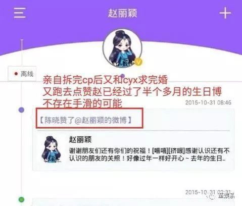 但让人不解的是,当年前脚陈晓和陈妍希求完婚,后脚又突然点赞赵丽颖半个月以前的生日微博。