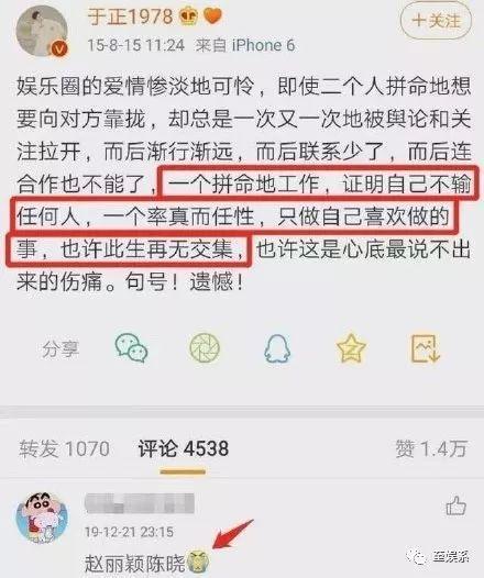 于正也不是第一次内涵两个人了,15年他发了一通感慨,暗戳戳爆料赵丽颖和陈晓分手的原因是舆论和被过度关注。