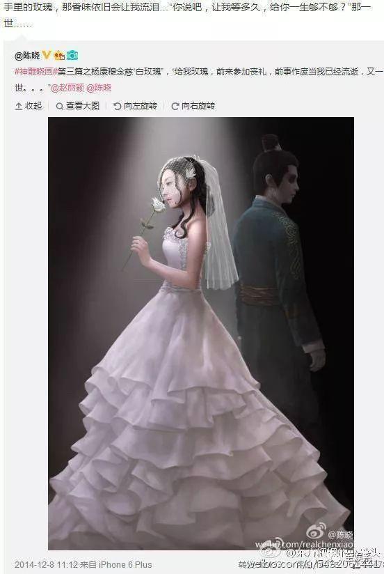 13年的《神雕侠侣》是一个神奇的交汇点,一头是颖晓CP继续营业,赵丽颖客串穆念慈、陈晓赵丽颖牵手视频曝光、陈晓画穆念慈婚纱图。