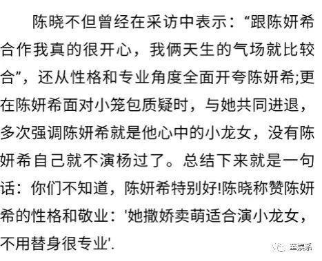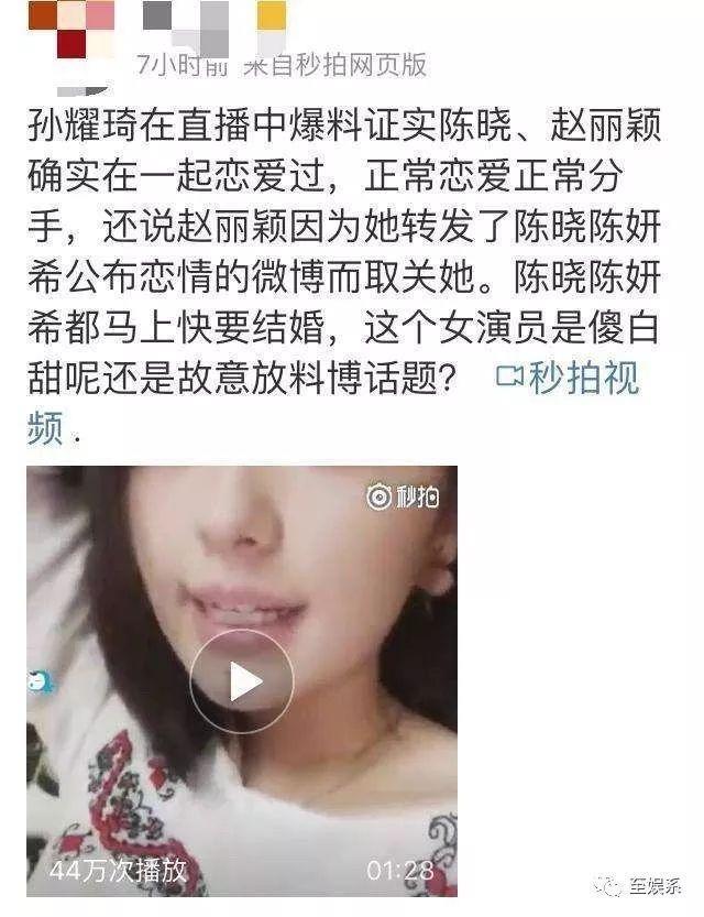 这里还有一个小插曲,陈晓陈妍希公开恋情后,曾经和赵丽颖合作过《新还珠格格》的孙耀琦在直播里透露:赵丽颖陈晓是真的,而且因为她转发了双陈公开恋情的微博,赵丽颖还一度取关她。