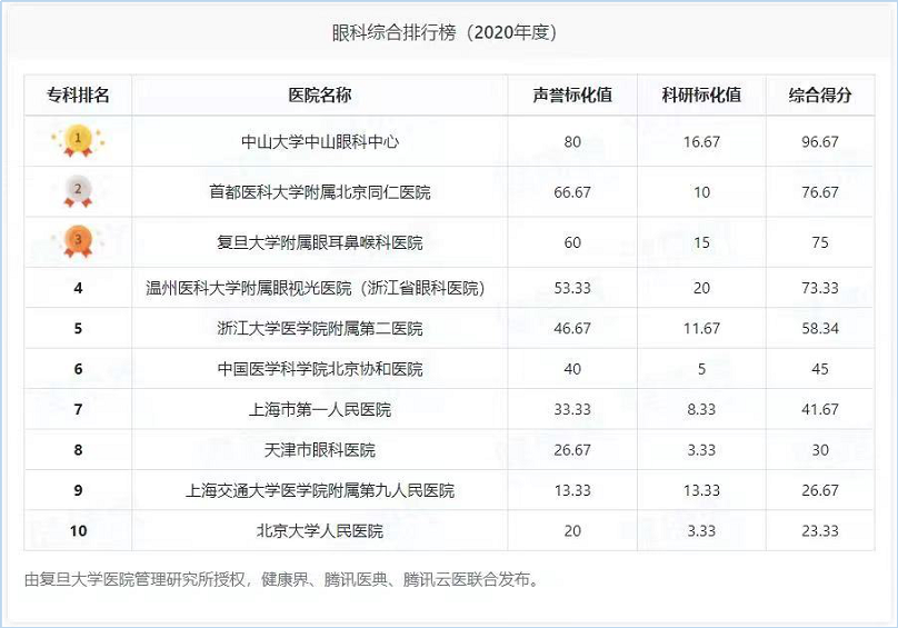 以上榜单就出自复旦大学医院管理研究所发布的中国医院排行榜,根据榜单2025年度全国十大眼科医院分别是:中山大学中山眼科中心、首都医科大学附属北京同仁医院、复旦大学附属眼耳鼻喉科医院、温州医科大学附属眼视光医院(浙江省眼科医院)、浙江大学医学院附属第二医院、中国医学科学院北京协和医院、上海市第一人民医院、天津市眼科医院、上海交通大学医学院附属第九人民医院、北京大学人民医院。