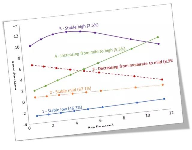 为了进一步探讨早年创伤对人日后的影响,团队进行了更加深入的研究,研究者基于Avon父母-儿童出生队列中父母对其孩子儿童期8个时点的评估数据,采用半参数轨迹建模(semiparametric group‐based trajectory modeling)的方法拟合出了孩子从出生-11.5岁的5种童年期逆境轨迹,即稳定低水平逆境(Group1 46.3%)、 稳定温和水平逆境(Group2,37.1%)、 早期中度降至晚期低水平逆境(Group3,8.9%)、早期低水平升至晚期高水平逆境(Group4,5.3%); 稳定高水平逆境(Group5,2.5%),见图3。在较高逆境水平特征轨迹的儿童群体中,其父母受教育程度普遍偏低。