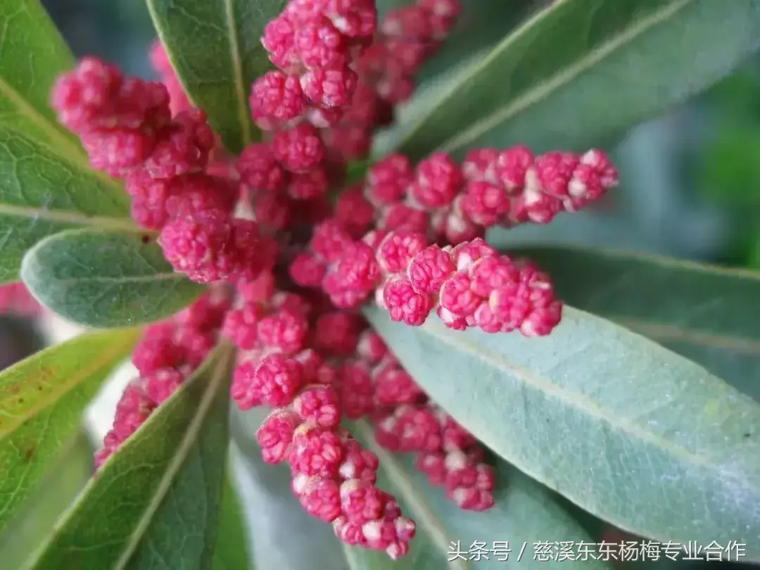 杨梅雌花序上有许多小花(实为柱头),甚小,娇嫩如雀舌两瓣,无桃花之娇艳,甚至没有“花”的模样,却是小巧玲珑,羞涩含蓄,无媚态俗香,不招蜂惹蝶,外柔内刚,有古典美女之风韵。雌花常不被目见,唯用心者才能欣赏。初始粉红露尖,继而鲜红渐长,直至暗红凋零,珠胎暗结。花期一般自3月中旬至4月上中旬,历时二十余天。