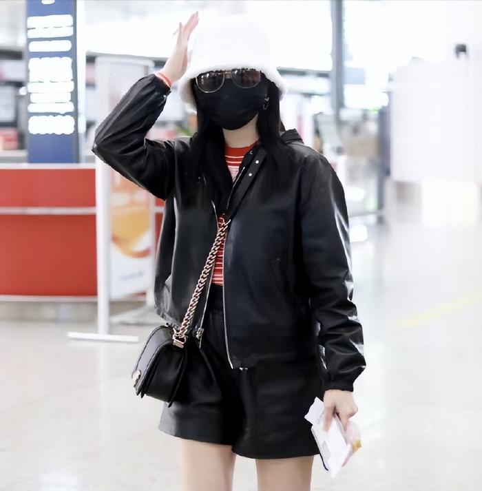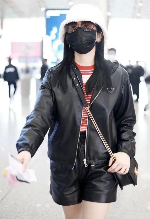 陈妍希这种造型,整体的感觉其实是比较和谐的,皮质面料的夹克衫,搭配上同样皮质面料的短裤,一身基础的黑色穿出纵向上的延伸性,皮质的面料虽然延展性不强,好在衣服的款式带有足够的空间感,整体的造型既秀身材又很拉风。