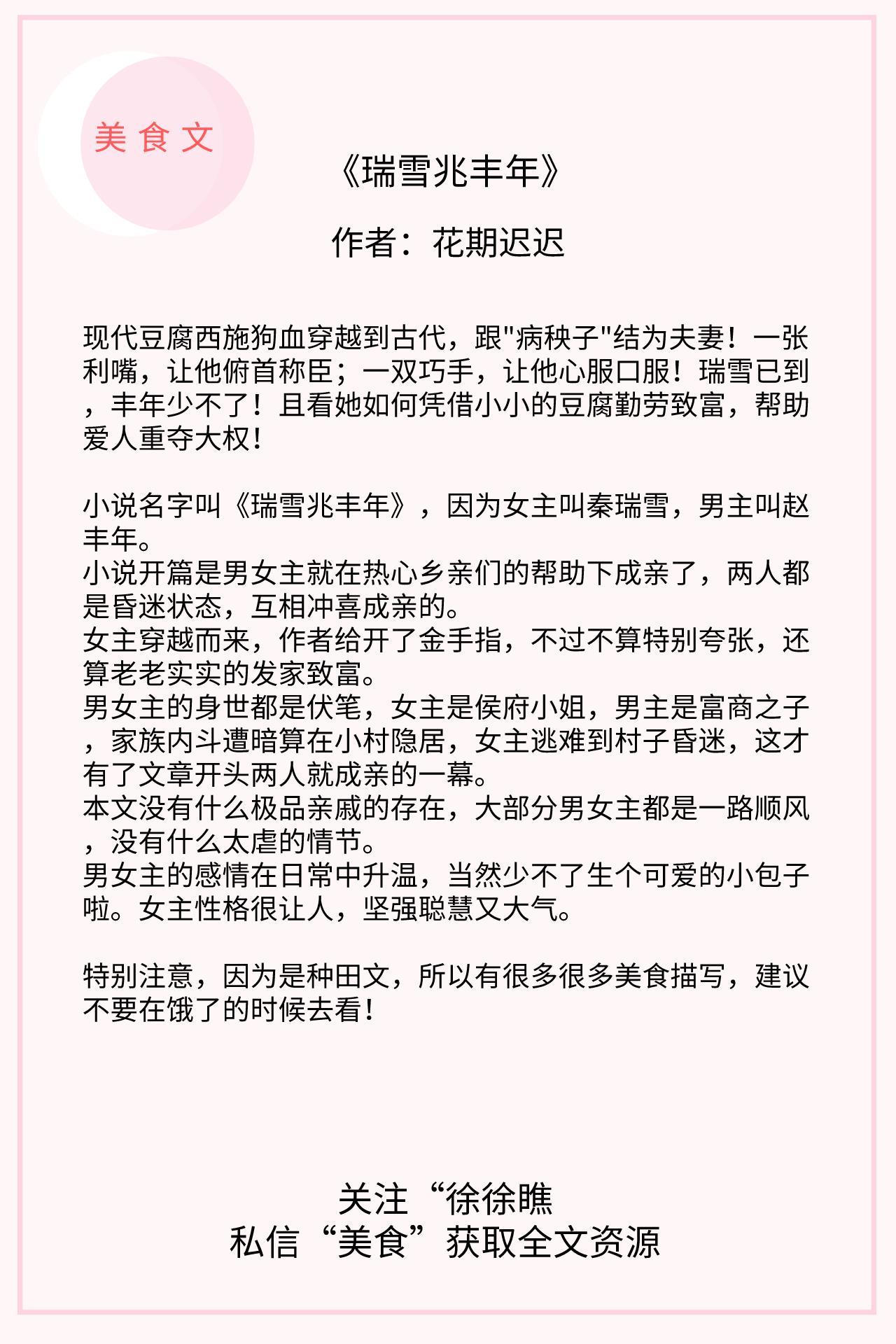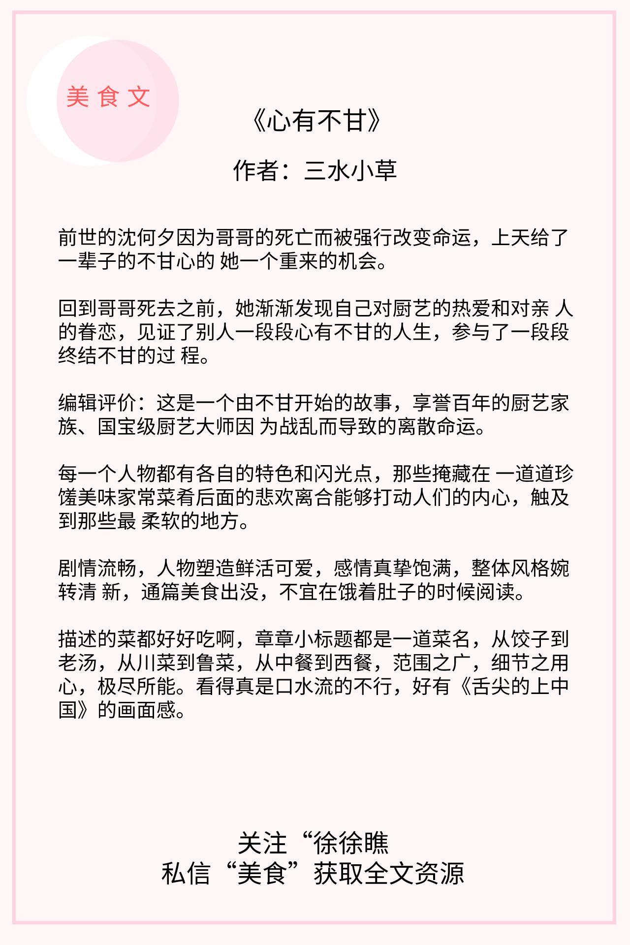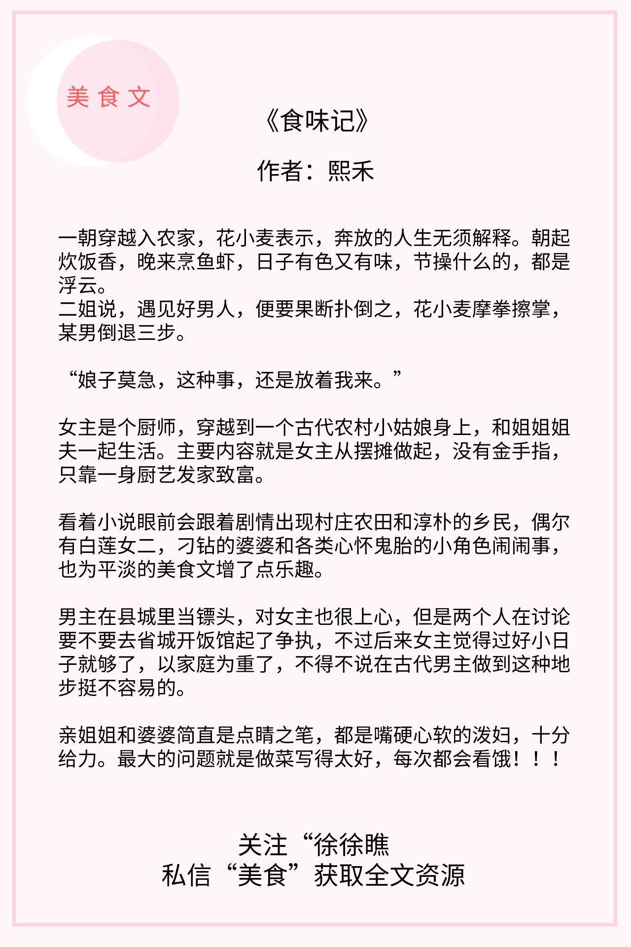 关注“徐徐瞧”,点击头像私信回复“美食”,立即获取以上全部小说资源!