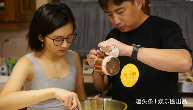 黄磊穿着一件黑色短袖,黄忆慈穿着一条浅色的背心,黄磊专心致志地在往铁盆里面倒入巧克力,黄忆慈则专心致志的在搅拌食材,黄忆慈还戴着一个眼镜,看起来十分的可爱,黄磊和黄忆慈父女两人同框看起来也是十分的温馨,不得不说黄忆慈还是很上镜的,如果不仔细看,还以为是黄磊新戏的剧照。