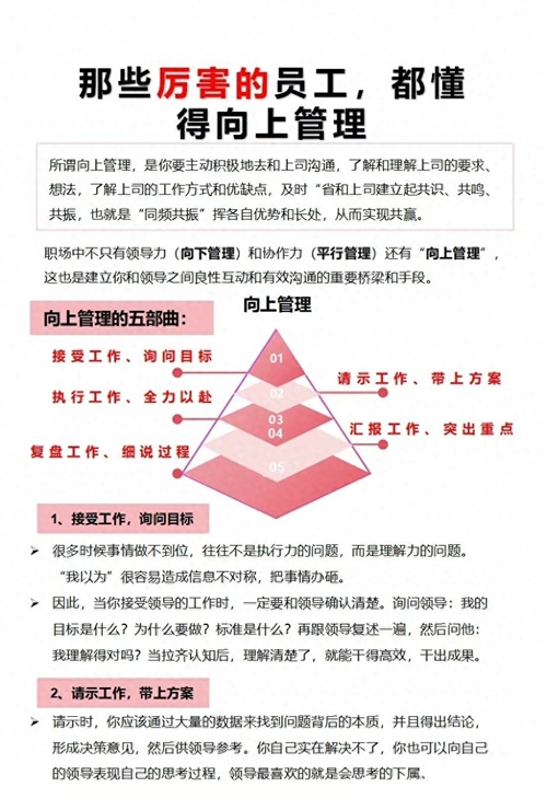 向上管理,又称为对上管理、上司管理或领导管理,是一种在组织中与上级有效沟通、建立良好工作关系,并通过影响和引导上级,以实现个人、团队及组织目标的策略。其核心理念是通过主动沟通、信息分享、明确期望、提供解决方案等方式,来获取上级的支持与信任,从而更好地完成工作任务,推动职业发展。