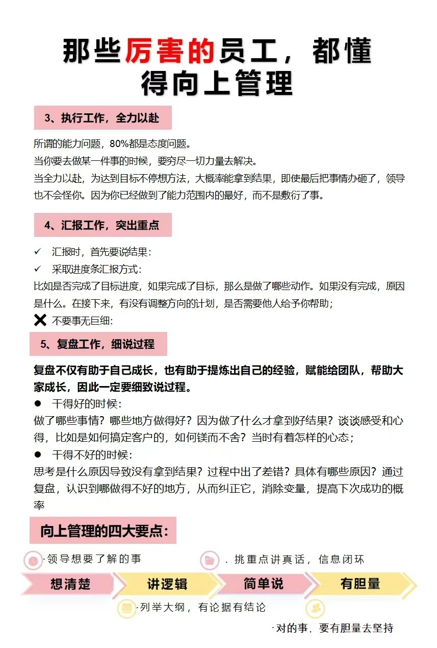 1. 深度理解上级的目标与期望:了解并把握上级的工作重点和战略方向,确保自己的工作与其保持一致。