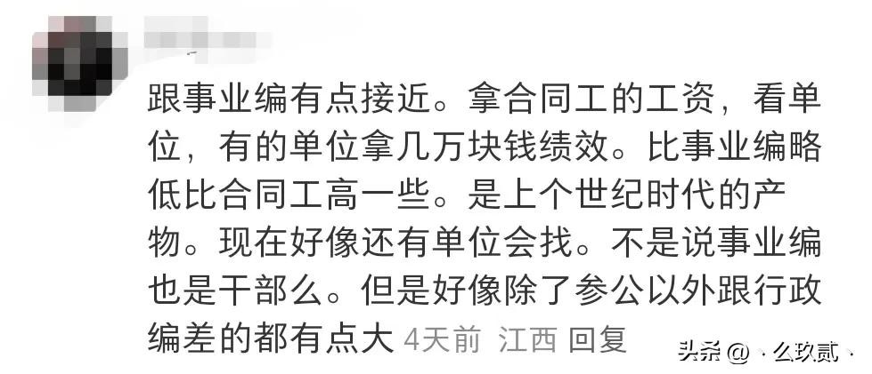 跟事业编有点接近。拿合同工的工资,看单位,有的单位拿几万块钱绩效。比事业编略低比合同工高一些。是上个世纪时代的产物。现在好像还有单位会找。不是说事业编也是干部么。但是好像除了参公以外跟行政编差的都有点大