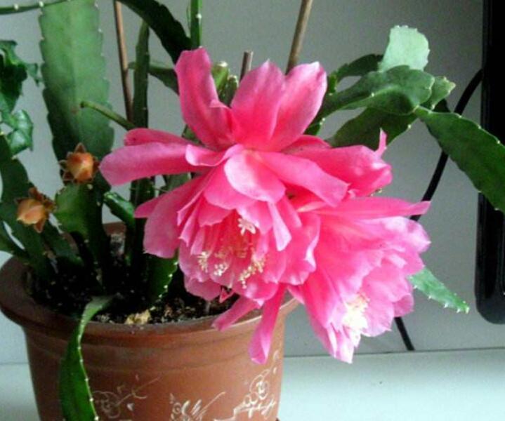 令箭花喜温暖,在春、秋两季花盆置于阳台朝南处,保持通风透光;夏季高温期避免暴晒,置于阴凉通风处,可向植株周围喷水保持湿度;入冬前搬入室内置于阳光充足之处,保持室温在10∽15度,温度太高植株会徒长也不利于开花,株型失去美观。