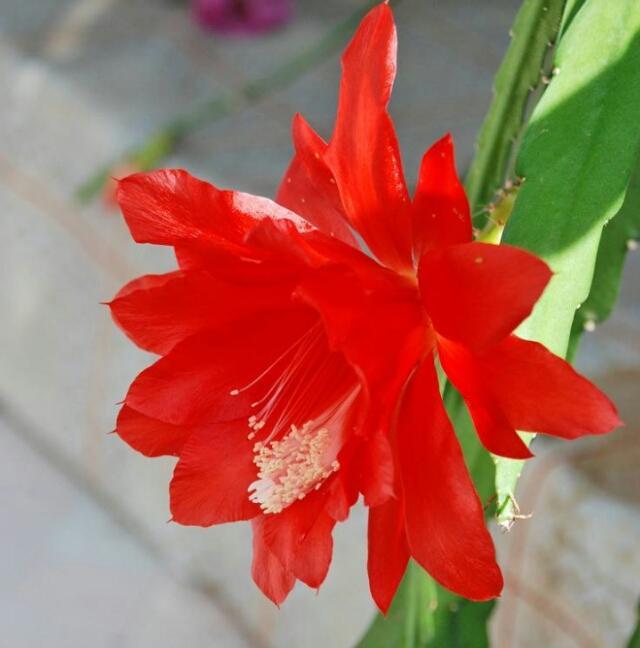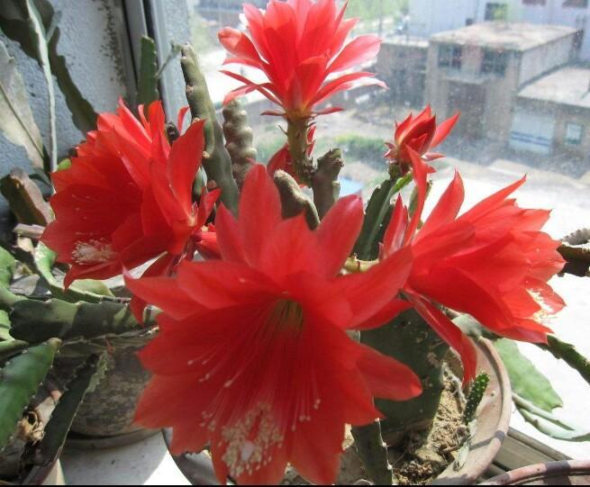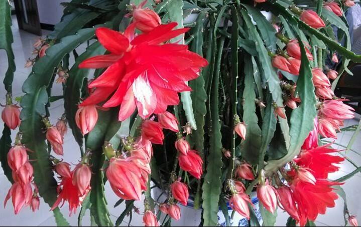 令箭花又称令箭荷花,是多年生草本观赏植物。它原产于干旱暖热地带,耐旱性特别强。此花有10多个品种,花美丽鲜艳又多,花色有红、黄、白、粉、紫等颜色,盛开于4-5月份。由于它生长的快又好栽培,适合置于阳台、窗台等室内。