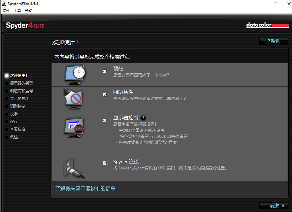 确认满足所有情况,尤其是将校色仪连接线插入主机或显示器,打勾之后就可以按“前进”进入下一步