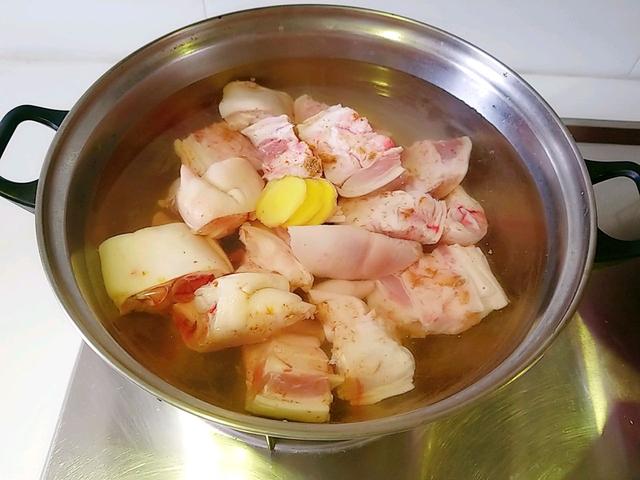 猪蹄让店家帮忙剁好,冷水下锅,姜片料酒,大火烧开,撇去锅中浮沫,捞出猪蹄洗净备用。