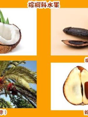 棕榈科水果(核果):椰子、槟榔、海枣(椰枣)、蛇皮果等,水果的分类标准三种。