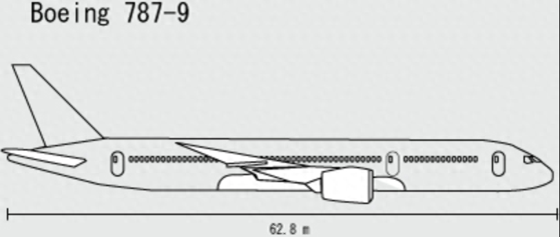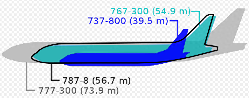 各种机型大小比较:787-8(黑色轮廓线)、777-300(灰色)、767-300(蓝绿色)以及737-800(蓝色)