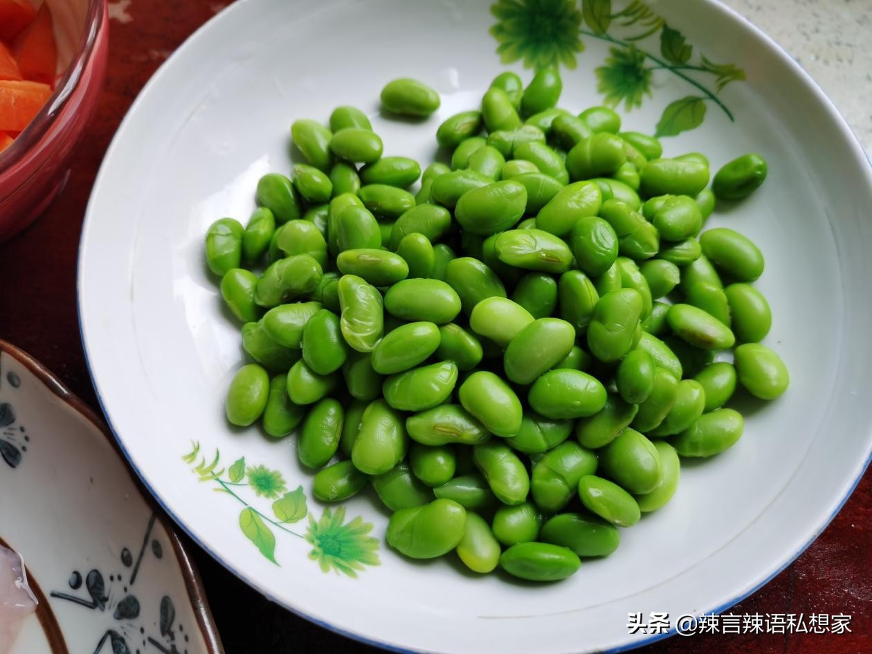 1.毛豆剥好后煮一下,清除掉豆衣。胡萝卜切成小丁。