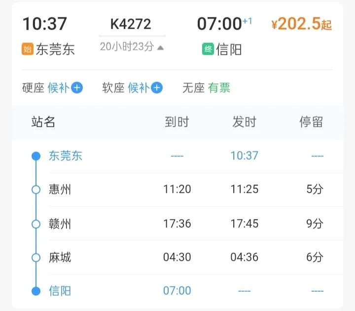 K4272是一趟从东莞东站始发,终到信阳的旅客列车,这也是今年春运期间为方便旅客出行而临时加开的一趟旅客列车,列车在东莞东站始发的时间为上午10:37,抵达终点站信阳车站的时间为第二天上午07:00,全程共用时20小时23分。