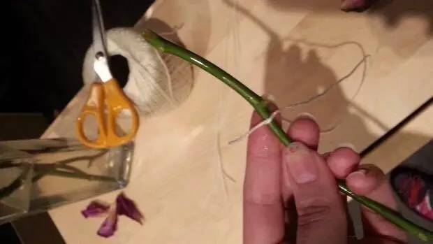 最好找到一个生长结,比较容易捆绑,或者可以在花根部分绑上一个小皮圈,绳子比较不容易花落