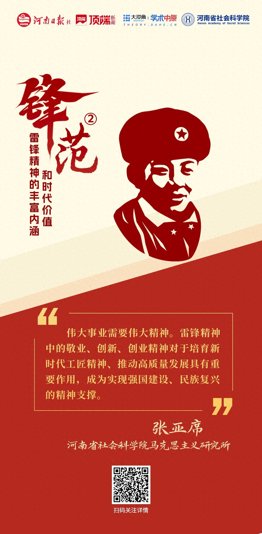 编者按:雷锋精神历久弥新,激励和影响着一代又一代人奋发向上。雷锋精神中蕴含的劳动精神、奋斗精神、奉献精神、创造精神、勤俭节约精神,是推动社会进步的巨大精神动力,成为一代代中国人共同的精神标杆。无论时代如何变迁,雷锋精神永不过时。新时代新征程,如何大力弘扬雷锋精神?在第62个“学雷锋纪念日”和第26个“中国青年志愿服务日”到来之际,大河网学术中原推出《“锋”范》特别策划,和网友一起感悟雷锋精神、传承模范力量。