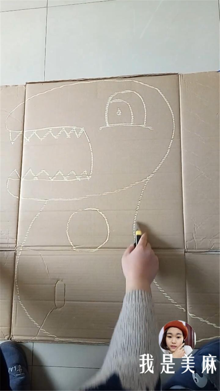 首先,用白色粉笔在纸板上画一只可爱的恐龙,最好选用硬点的纸箱,画好之后用刀裁下来。
