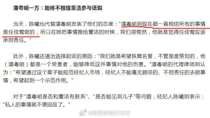 戏剧性地来了,在董洁团队发布声明后,潘粤明也发了律师声明,表示自己仅仅去过一次澳门,并且告的是董洁团队幕后掌控人,董洁的经纪人任佳莺。他完全不信这次董洁团队的“公关”跟董洁有关。