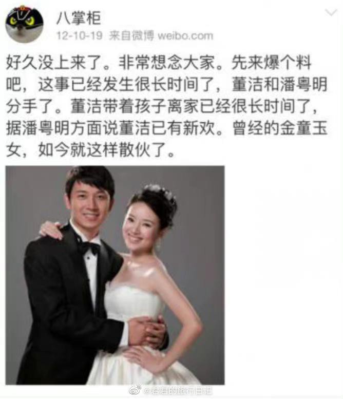 谁能想到,2012年年底,博主爆料两人分手,潘粤明方说董洁已有新欢。