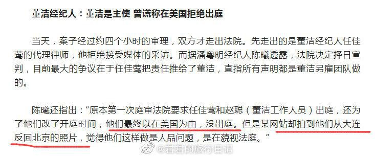 后来这场官司开打,董洁经纪人自知理亏,声明一通实则冤枉潘粤明。不仅拒绝出庭,还说写的这些都受董洁指使,董洁方的工作人员也谎称他们都在美国,然而却被狗仔拍到,他们正从大连返回北京。
