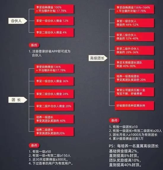 “对于高级团长来说,每培养一名直属高级团长,就能提高2%基础佣金,直到提高8%封顶,团队奖励提高10%,直到提高40%封顶。”据一位高级团长表示:“升级高级团长之后,除了享受每一级下线更多的佣金分成之外,更引人注意的是‘享受公司提供五险一金,好省提供各种政策扶持这’一条款,似乎代表达到这一等级之后,就顺利成为了好省的正式工作人员。”