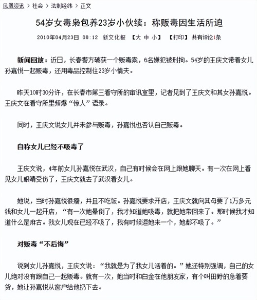 54岁女毒枭包养23岁小伙续:称贩毒因生活所迫.凤凰资讯-新文化报. 2010年04月23日