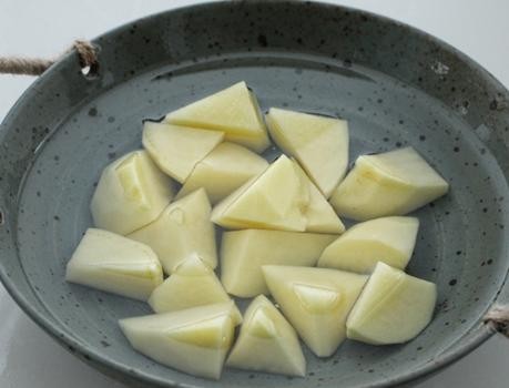 第三步,大火锅开后,放入茄子块,同时在水里加上几滴白醋,继续煮2分钟,待时间差不多后,将茄子和土豆块捞出来,控干水分,让茄子放入事先准备好的凉水中,过一遍凉;