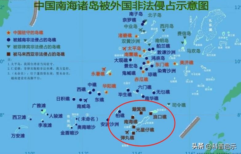 在南海蹦的最欢的菲律宾也侵占了9个,其中就有5个自然岛屿。分别于1970年、1971年、1978年及1980年非法侵占了中国马欢岛、费信岛、南钥岛、中业岛、西月岛、北子岛、双黄沙洲和司令礁。