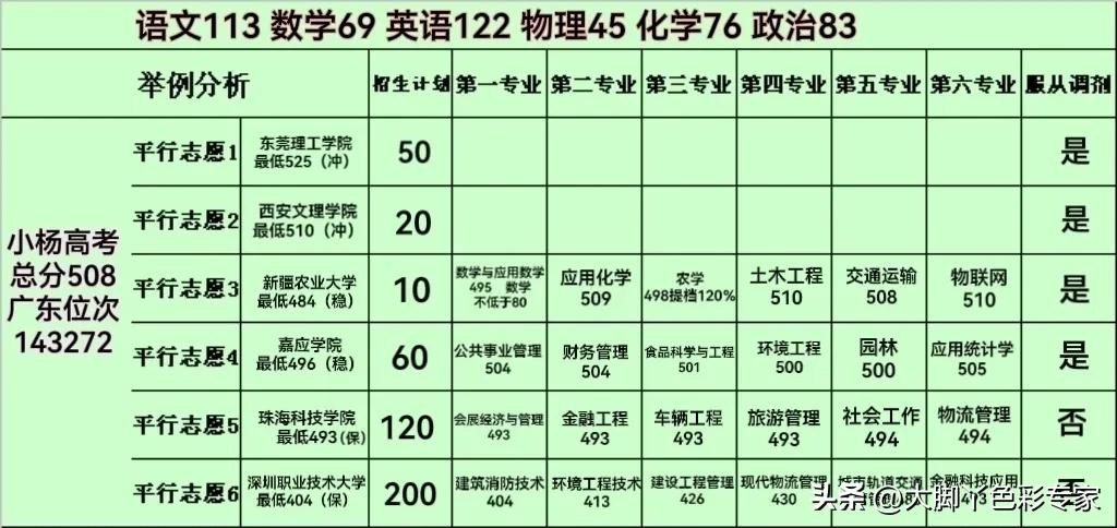 小杨同学高考成绩508分,广东全省排位143272名。成绩比较尴尬,但小杨同学还是期望考上本科院校,最大愿望入读公办本科,既可为父母省钱又可实现自己理想。