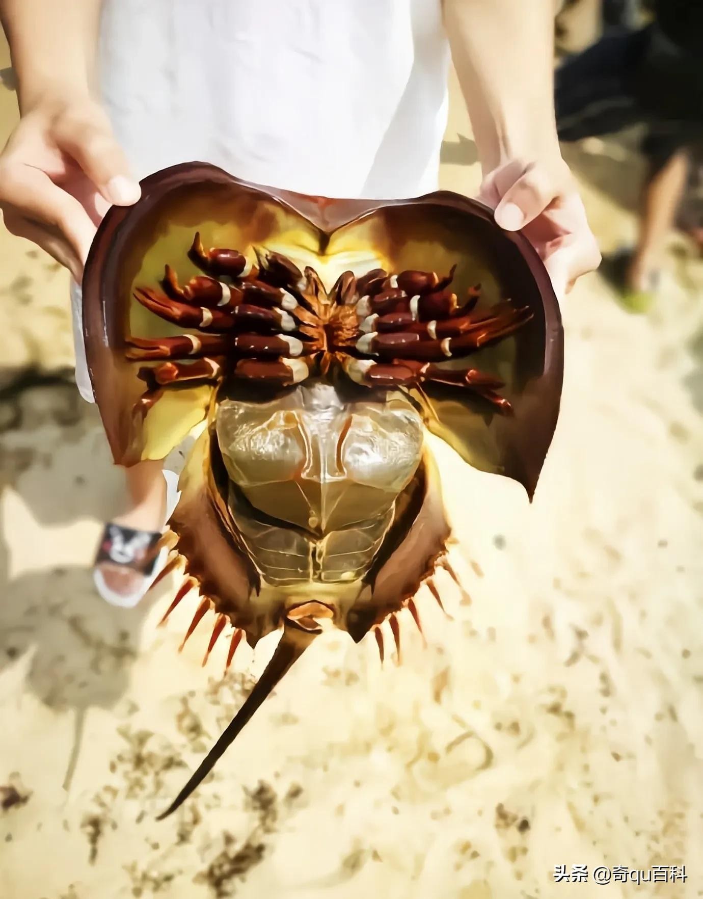 中华鲎(hòu)是一种十分古老的海洋节肢动物,体长可达60厘米,体重3-5千克。鲎由三部分组成:头胸甲略呈马蹄形(故名马蹄蟹)。最早存在于4.75亿年前奥陶纪,被称为"海洋活化石"。与其他节肢动物不同,中华鲎寿命长,生长缓慢,性成熟至少需要13年。鲎的血液因含有铜离子显示蓝色,故中华鲎血液为蓝色。它们分布于中国、印度尼西亚、日本、马来西亚、菲律宾和越南。