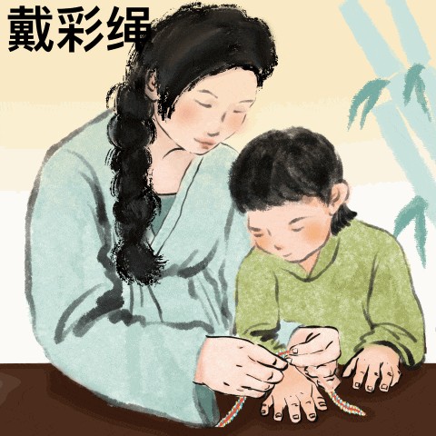 用红绿黄白黑色粗丝线搓成五色丝线饰物