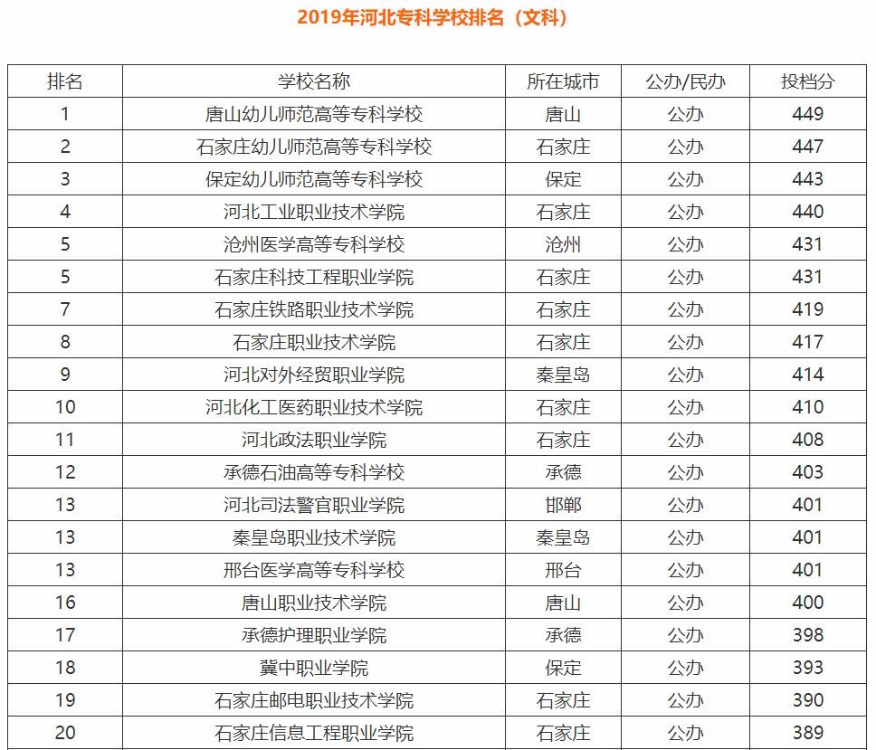 从软科发布的2019年河北专科学校投档分数排名(理科)中,以上5所大学从全省56所公办专科中脱颖而出,位居排行榜的前五名。