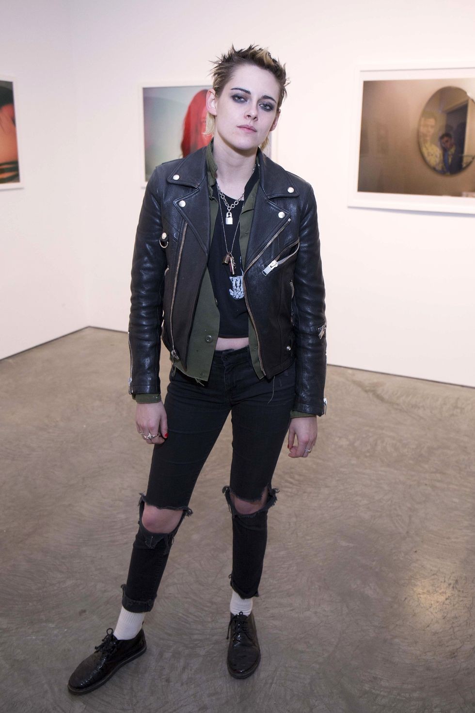 皮衣是每个酷酷女孩的首选。克里斯汀也不例外。金属质感的短款皮衣,搭配黑色毛边破洞裤。身上金属的装饰提升了整体的光泽。寸头简直是女孩杀手啊!俊秀的脸庞,帅气的装扮,克里斯汀真的太可吧!