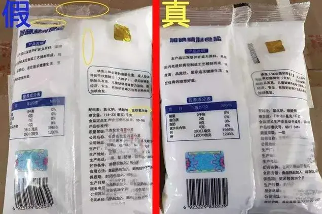通常,同一批食盐的防伪标记在同一位置且排列良好。当我们购买食盐时,我们可以多对比一下。将其与假的加碘盐袋比较。位置不均匀。