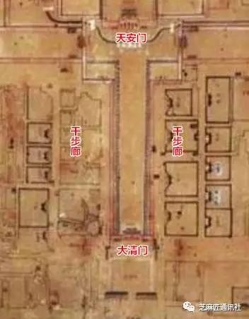 大清门以北东西两侧有千步廊,是六部日常办公的场所,千步廊夹着540米长、65米宽的中央大道:一横一竖呈“T”字形。