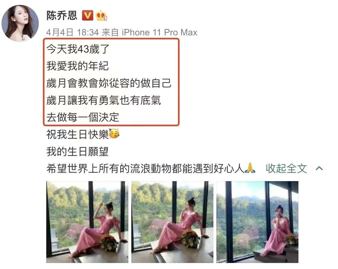 就在晒合照的前一天,陈乔恩还分享了一则关于他们婚后自驾游的视频,视频中的陈乔恩忙着各种摆拍,而丈夫艾伦在专注地开着车,偶尔在陈乔恩把镜头对准他的时候还会做一些动作配合妻子,举动都是满满的宠溺,而陈乔恩也经常忍不住想要记录下老公开车的样子,看起来这对新婚夫妇的婚姻生活过得十分的幸福,不过这时的陈乔恩已经43岁了,而老公也34了,如果要小孩的话也算高龄产妇了,那么他们还会打算要宝宝吗?但不管怎样,还是祝他们的生活幸福美满。