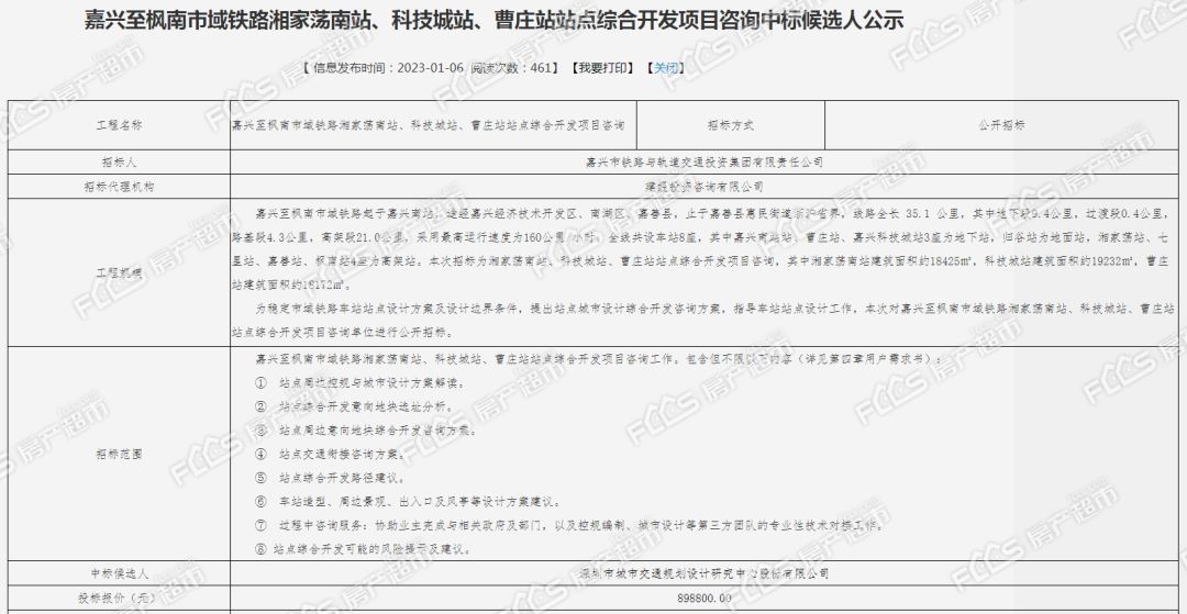 嘉兴至枫南市域铁路湘家荡南站、科技城站、曹庄站站点综合开发项目咨询中标公示